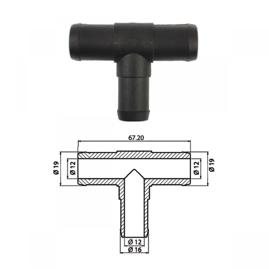 Тройник т-образный тосольный Ø19 x Ø16 x Ø19 пластик