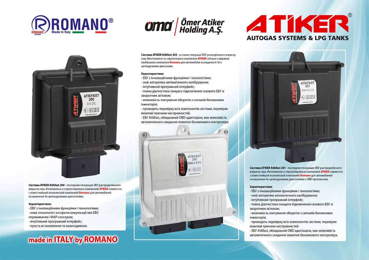 Завдяки успішній спільній роботі двох лідируючих компаній в секторі ГБО, ATiKER може запропонувати своїм клієнтам абсолютно нові і надійні системи Atikfast 200/201/203, які розроблені і вироблені в Італії на потужностях ROMANO. Це остання генерація електронних блоків управління розподіленого уприскування газу.